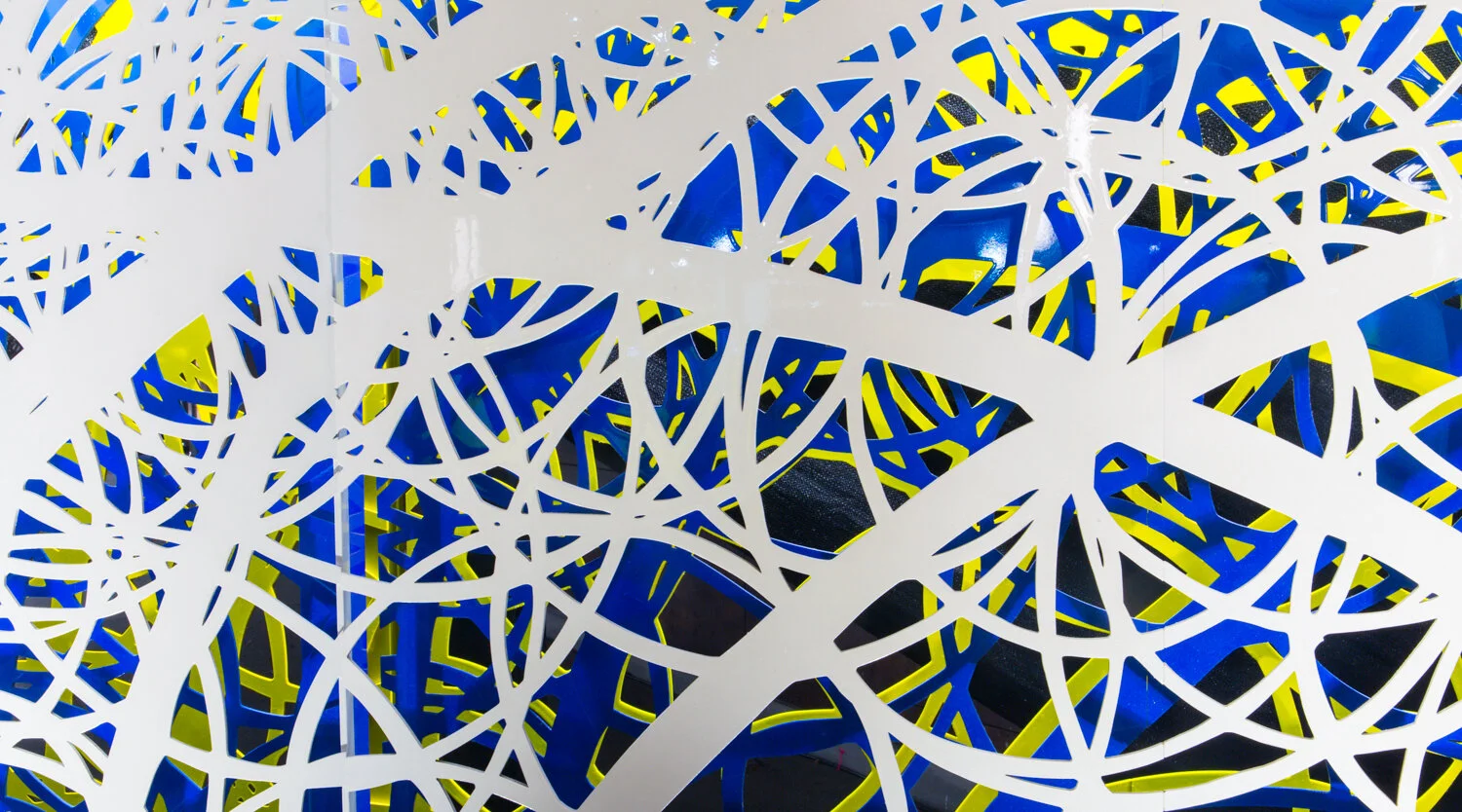 Made in collaboration with Adam Feibelman,”Pathways” traces the movement and beauty of the basketball as it travels, second by second, from the inbounding to the all-important basket. Twelve classic Warriors plays were mapped and meticulously drawn first onto paper, then hand cut and digitally traced and laser cut from stainless steel. Each circle represents the path of the basketball as it moves through the play, with spacing in proportion with the speed and trajectory of the ball. The use of color shifting paint creates movement and the multiple layers of metal creates depth.